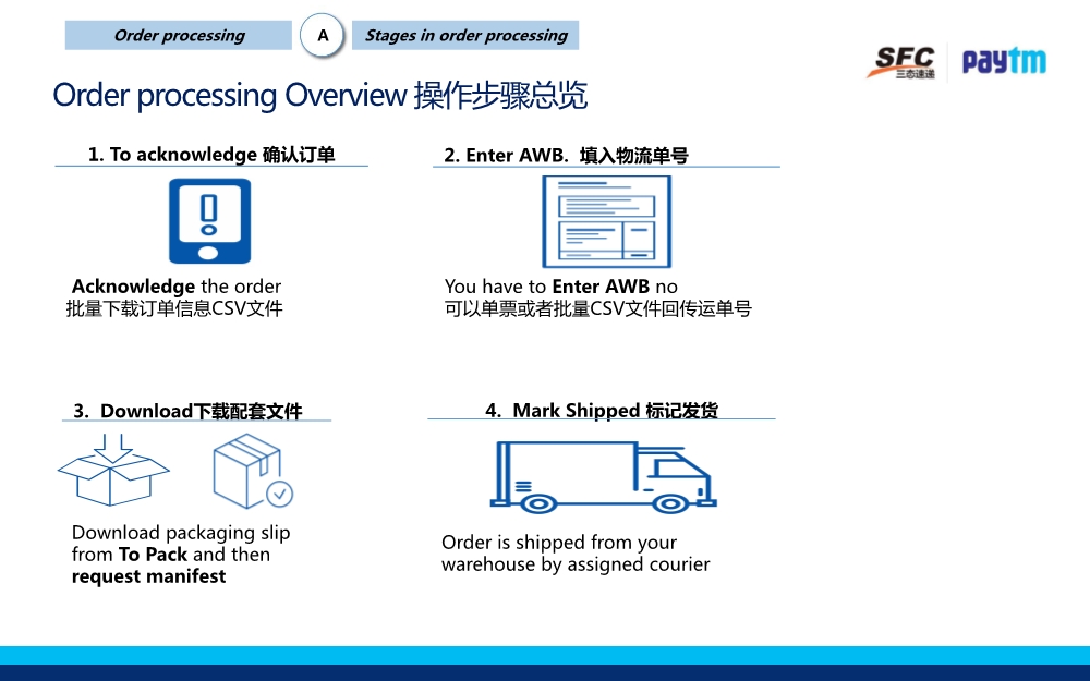 退件说明:平台只接受因卖家发错货物、发错尺码、货物损坏等情况的退件。退件货物会先退到Paytm质检中心进行QC质检,确认退货情况属实后再退至三态印度仓库。